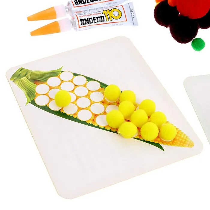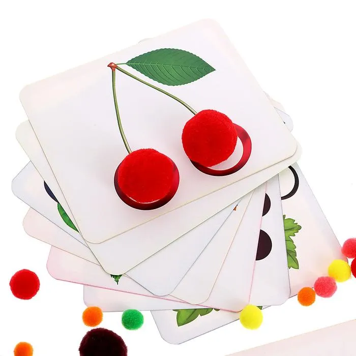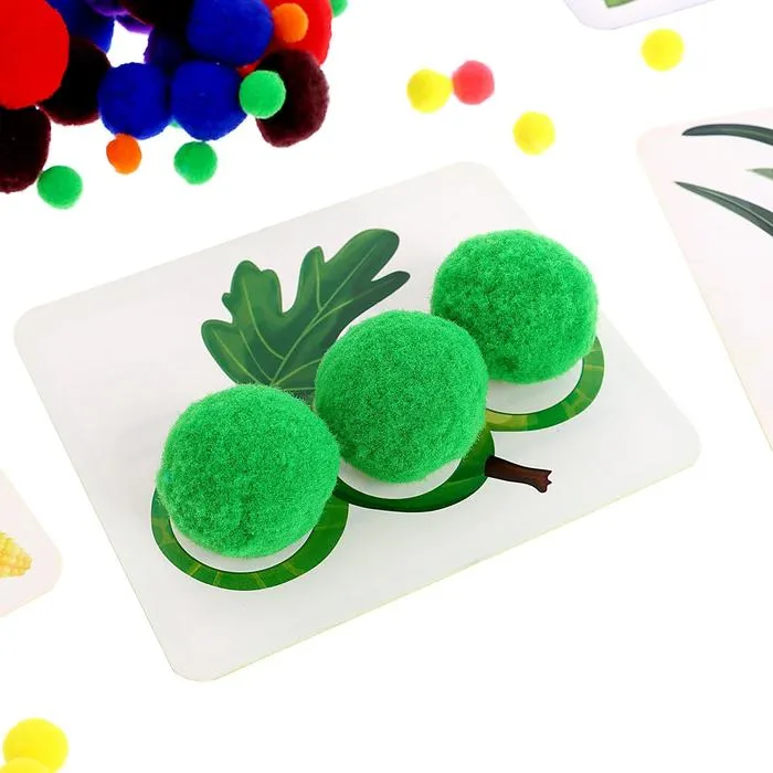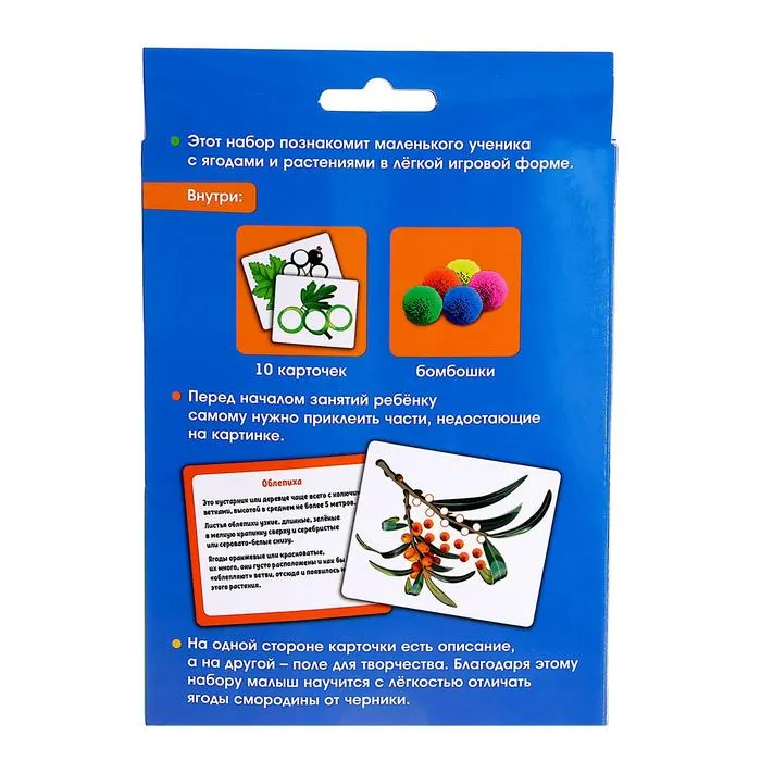 Внутри набора бомбошки раных цветов и размеров. Карточка представляет собой занимательное описание ягоды или растения с одной стороны и поле для творчества — с другой. Расскажите крохе познавательные факты. И попросите дополнить яркими цветными бомбошками объёмную картинку.