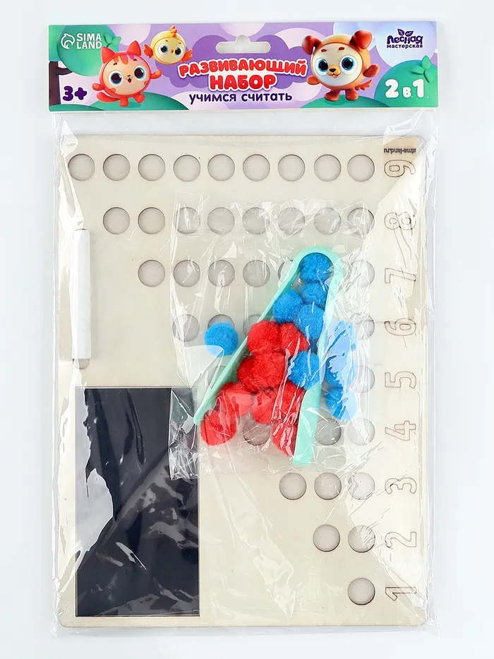 Играя с набором, ребёнок не только учится считать, но и развивает логическое мышление, знакомится с цветами и формами. Меловое поле позволяет родителям или педагогам писать примеры, а ребёнок с помощью шариков и пинцета находит правильный ответ. Это делает процесс обучения интерактивным и интересным.