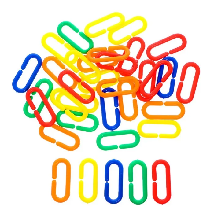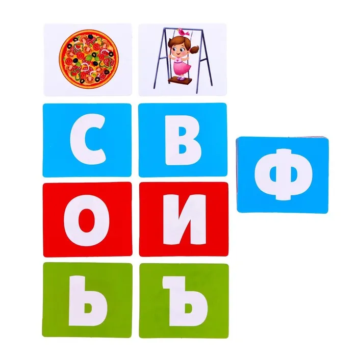 - Достаньте из коробочки всё содержимое: 35 звеньев и 33 двусторонних карточки с дырочками. На одной стороне находятся сюжетные картинки, на другой — буквы.