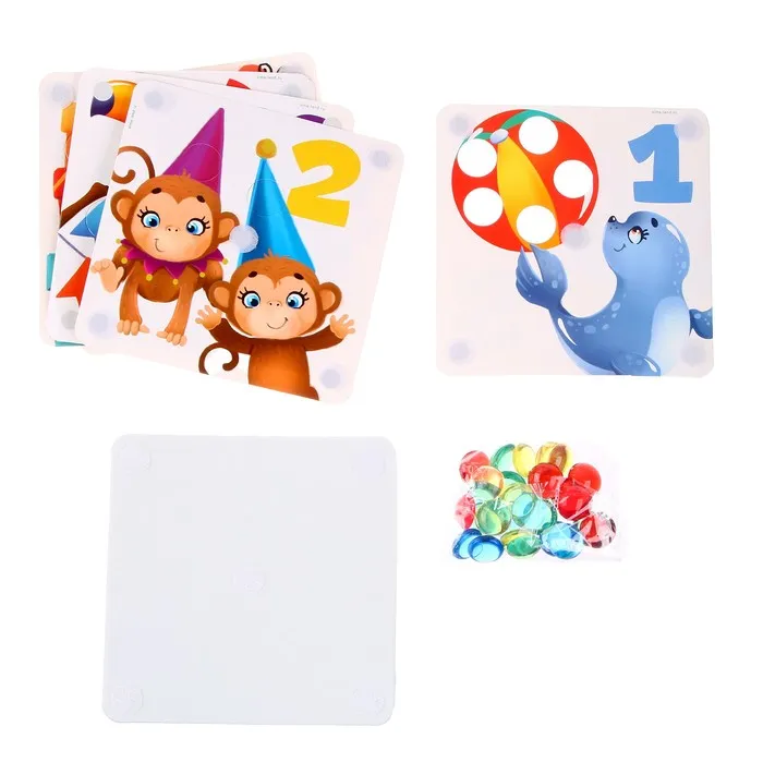 - Положите мягкую основу, с помощью липучек прикрепите к ней карточку. Выполните задание, используя камешки. Они провалятся в отверстие и зафиксируются на основе.