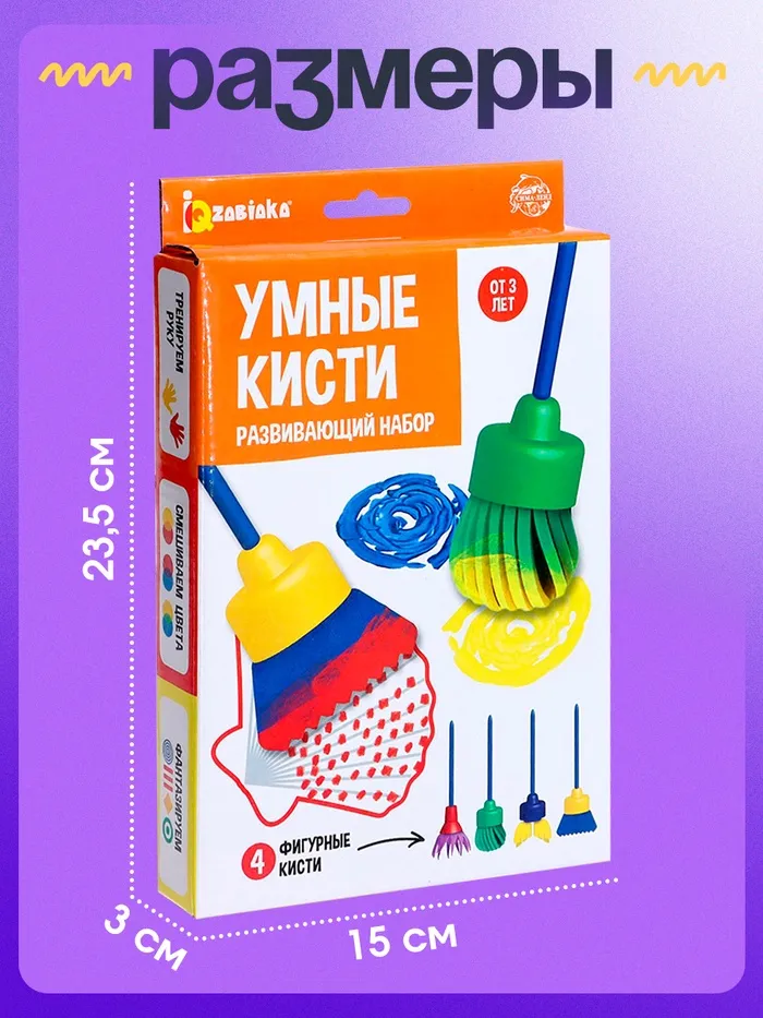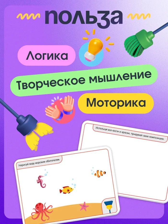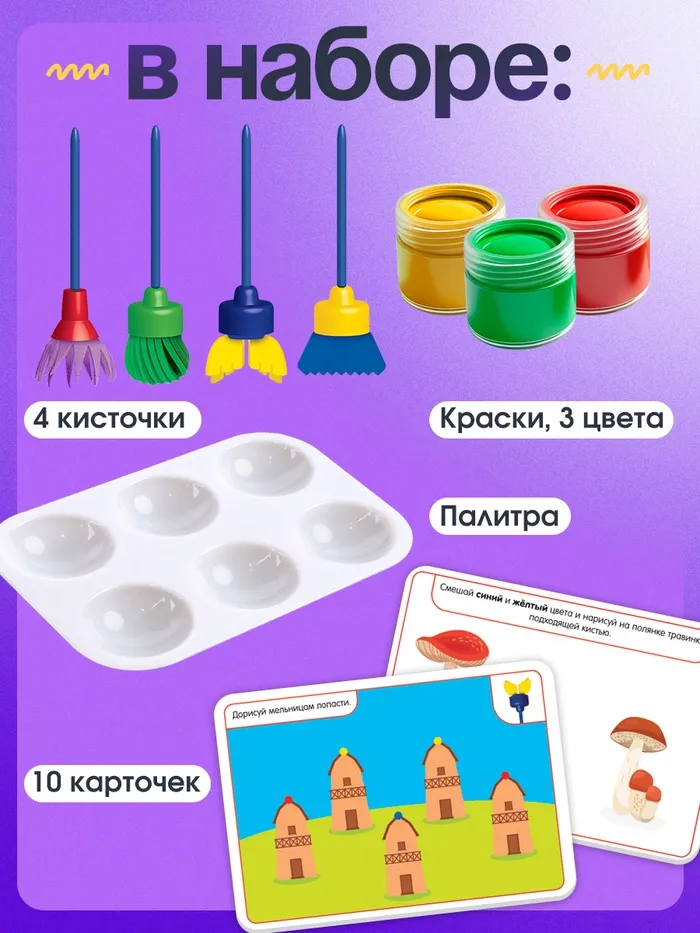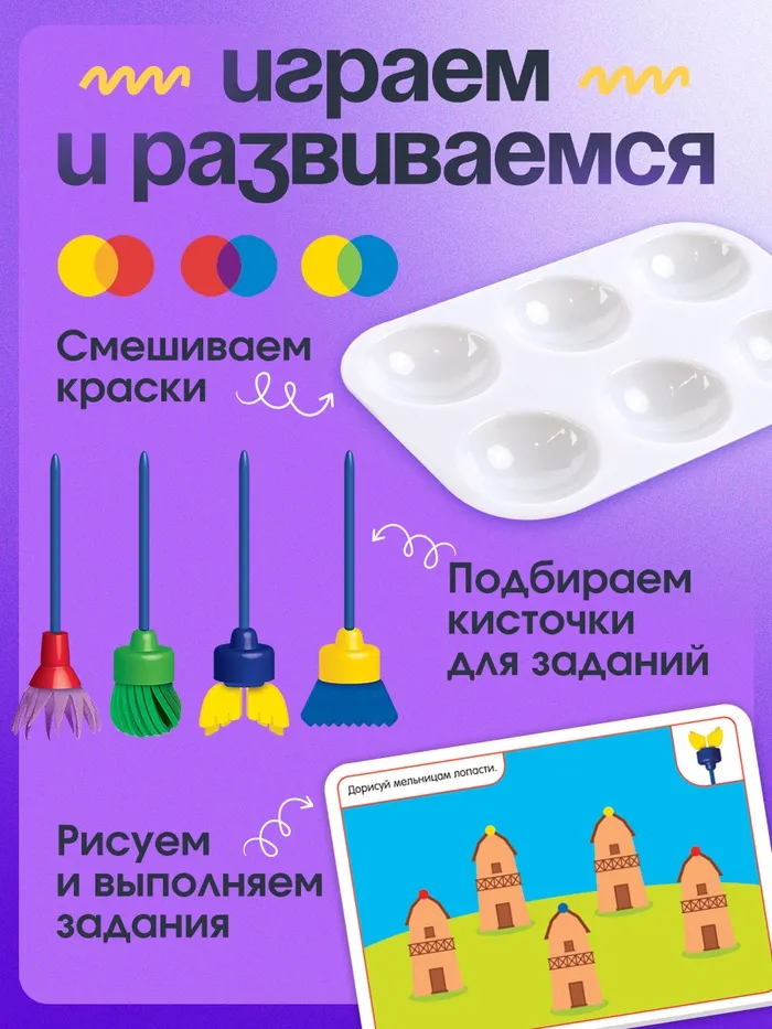С помощью набора малышу предстоит работать с фигурными кисточками, смешивать цвета, выполнять задания на карточках и просто весело фантазировать.