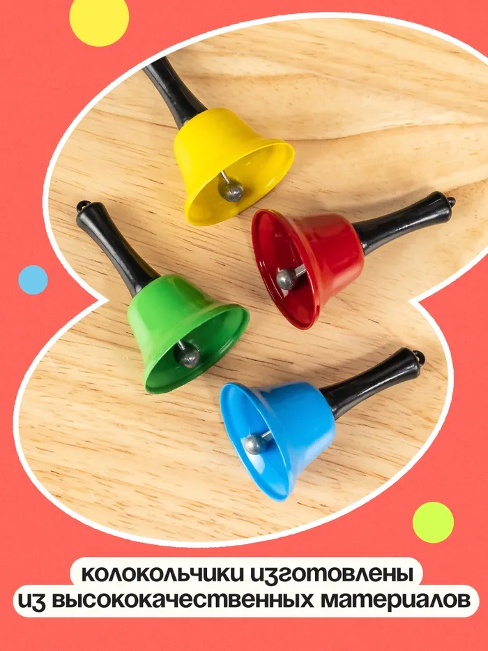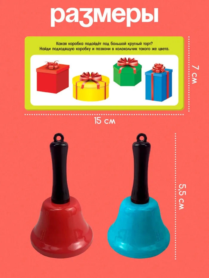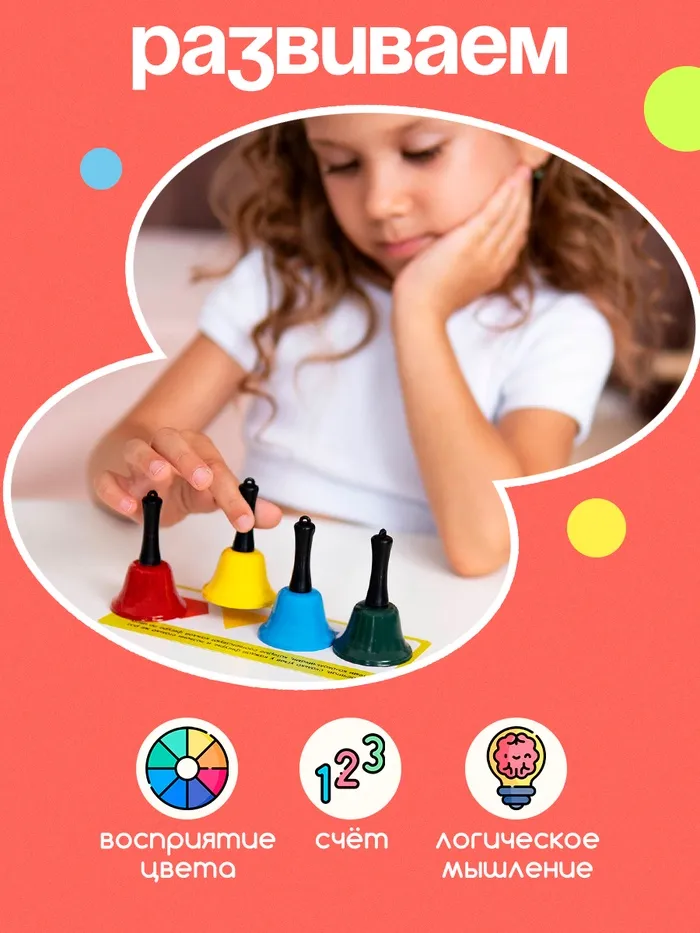 Развивающий набор станет любимой игрушкой вашего ребёнка! В нём малыш обнаружит 4 цветных звонких колокольчика. Они помогут ему запомнить цвета, цифры, научиться считать и решать много полезных заданий с карточек!