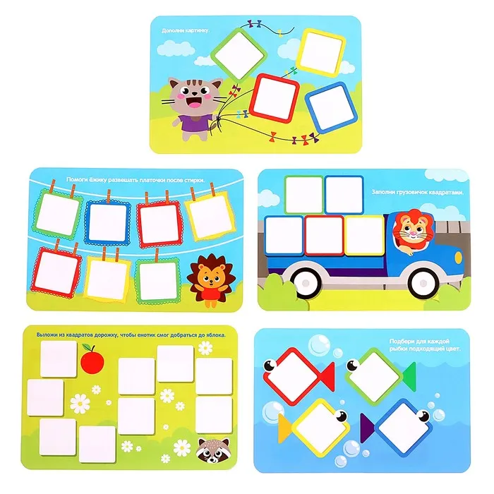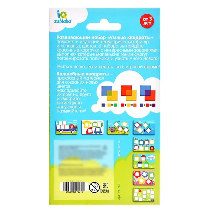 Развивающий набор «Умные квадраты» познакомит ребёнка с геометрическими фигурами и основными цветами. В комплекте малыш увидит красочные яркие карточки с заданиями. Они помогут ему узнать много нового и интересного.