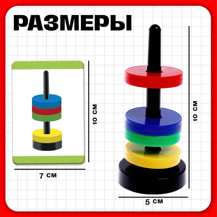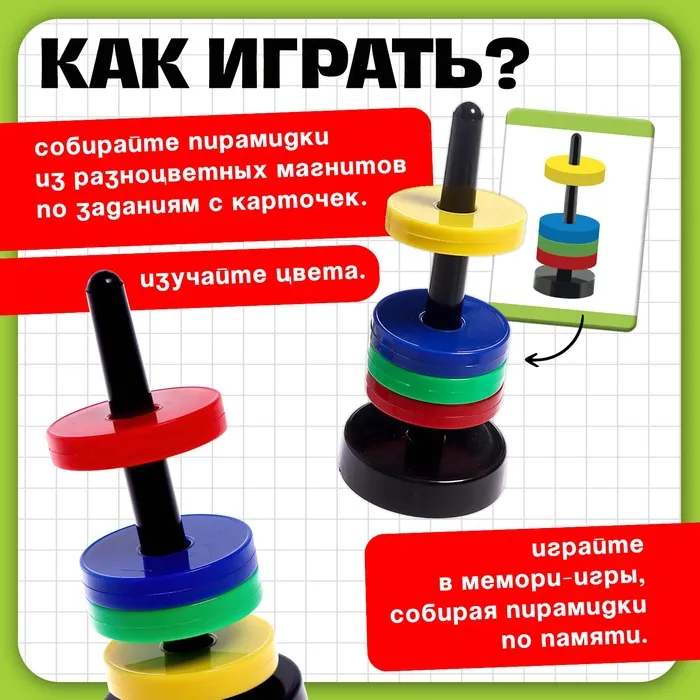 Попросите ребёнка внимательно рассмотреть карточки и составить пирамидки из магнитных фигурок в соответствии с цветами.