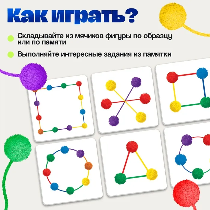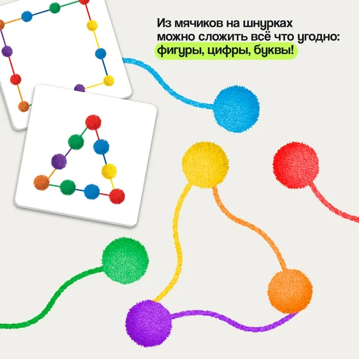 - 12 разноцветных мячиков на шнурках для создания фигур и узоров.