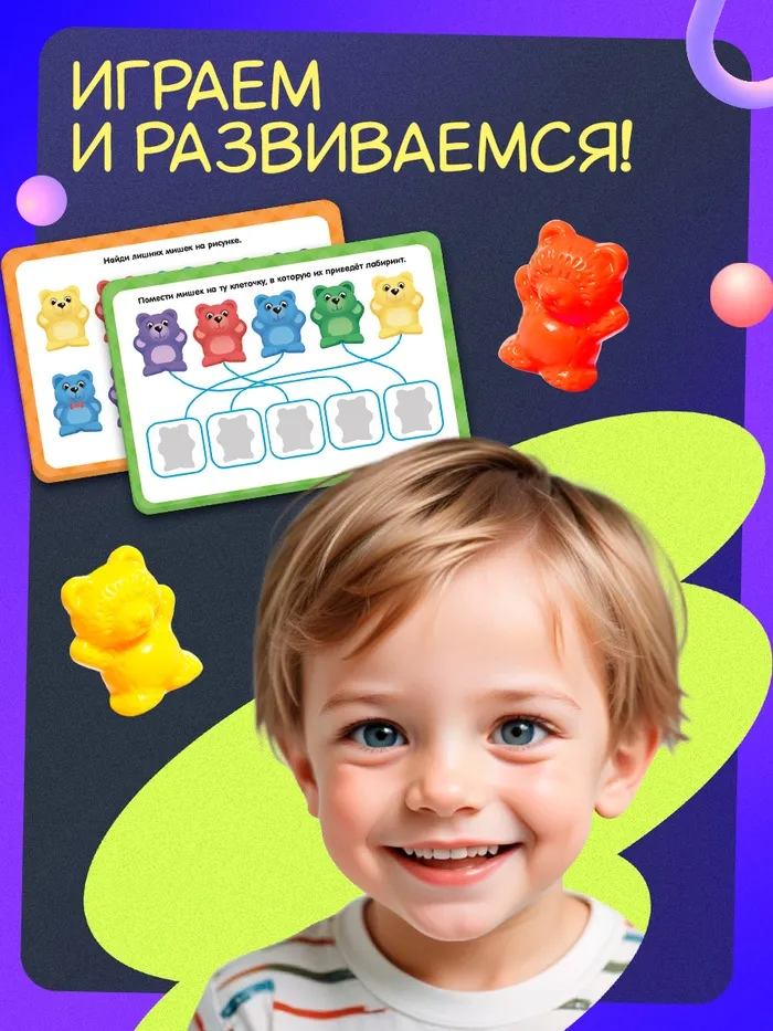 Игра создана для тренировки мелкой моторики, обучению цветам и счёту. Малыш будет раскладывать мишек пальчиками. Процесс можно усложнять, добавляя задания с карточек.
