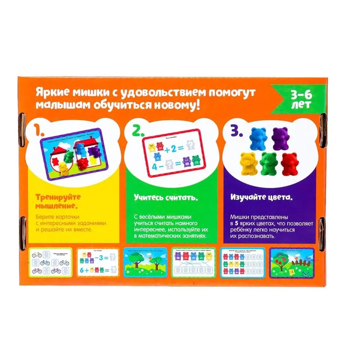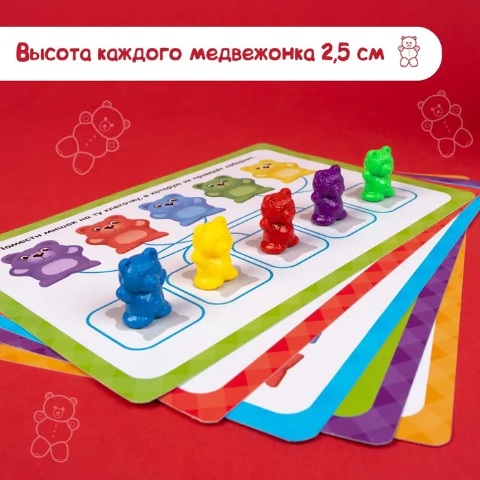 Высота каждого медвежонка 2,5 см, выполнены из пластика. Карточки картонные.