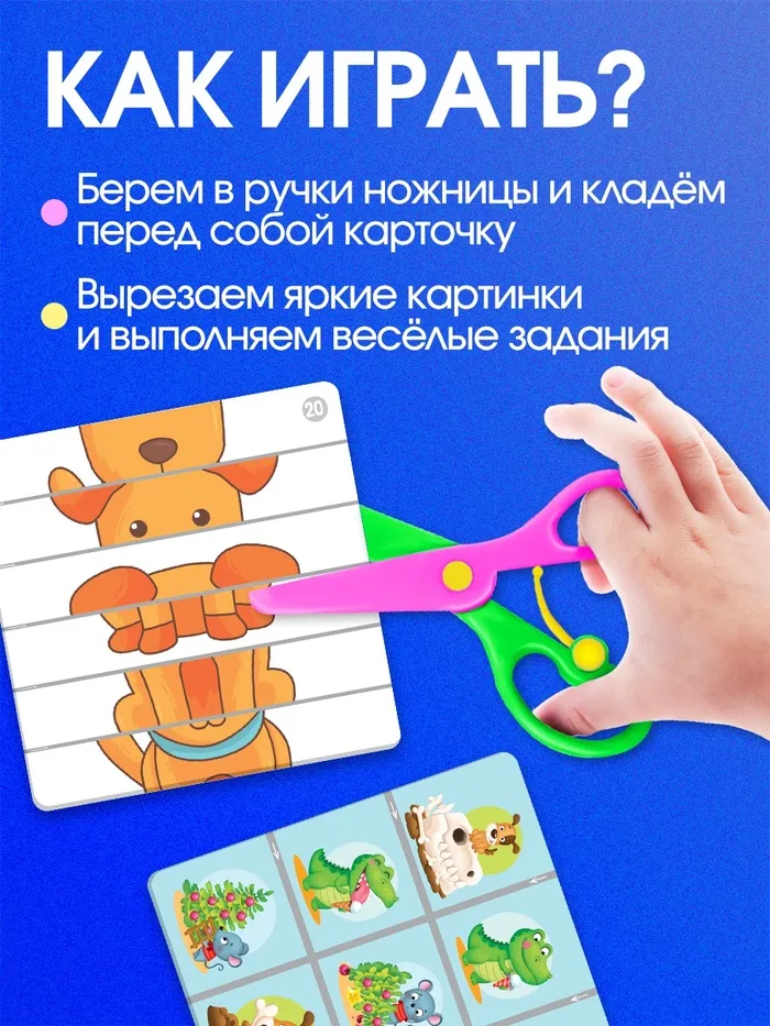 С этим набором малыш научится работать с ножницами. Он узнает, как ровно по контуру вырезать картинки из бумаги.