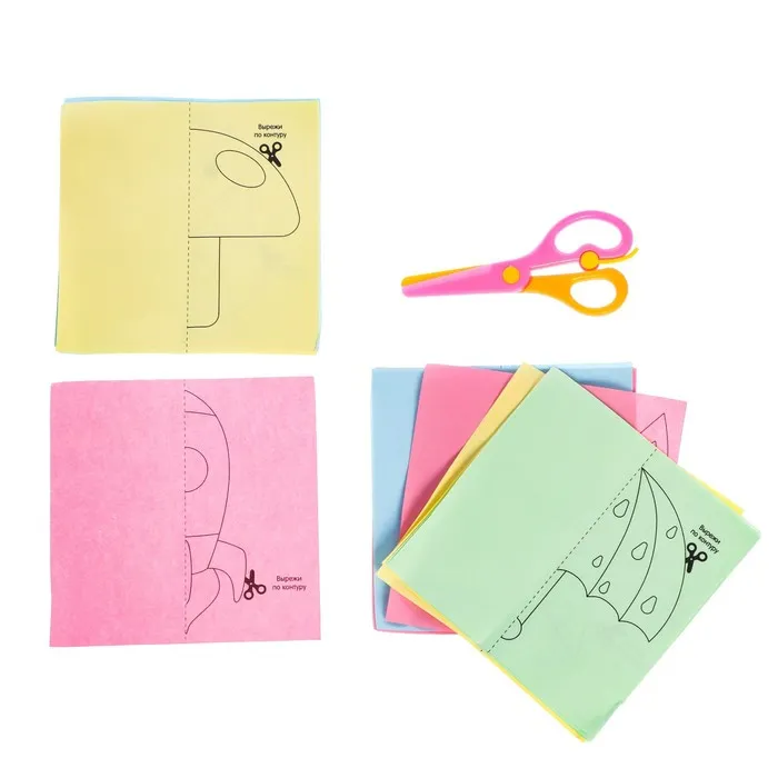 С этим набором малыш научится работать с ножницами. Он узнает, как ровно по контуру вырезать картинки из бумаги.
