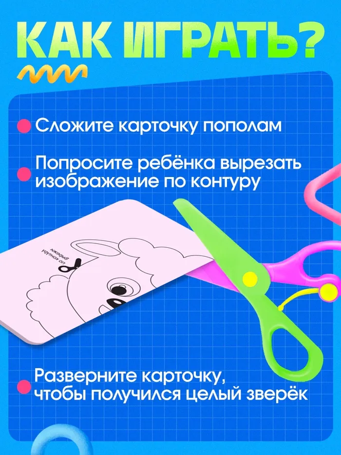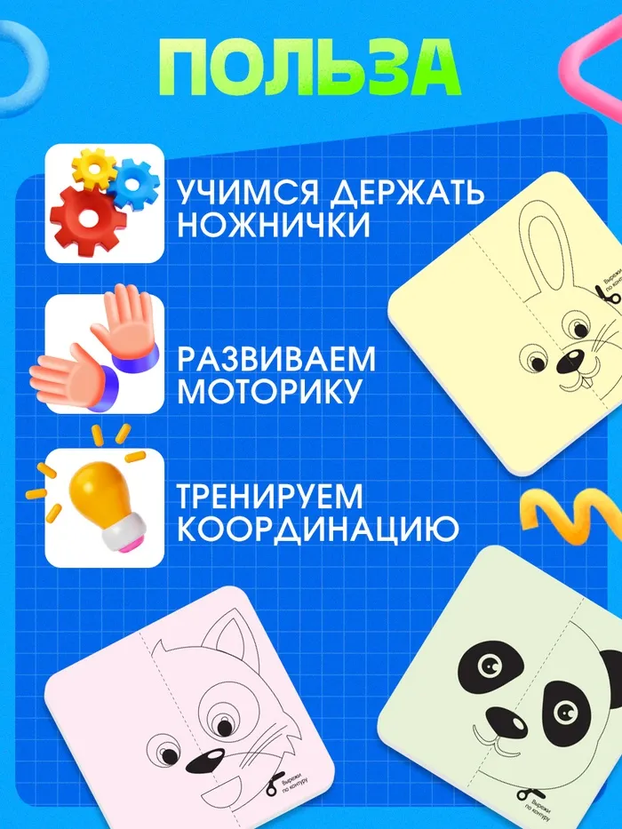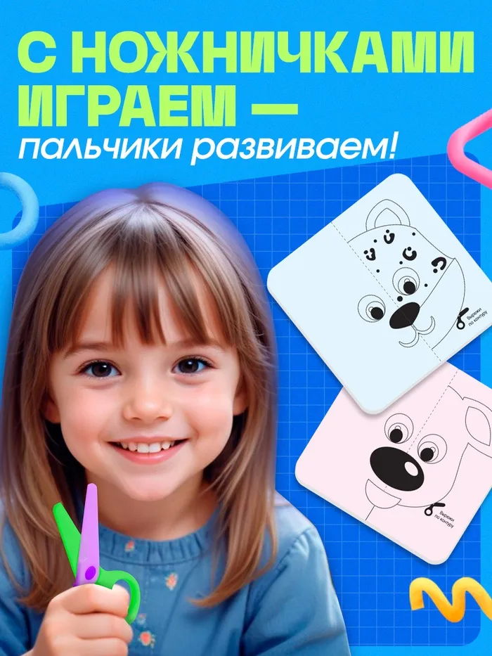 С этим набором малыш научится работать с ножницами. Он узнает, как ровно по контуру вырезать картинки из бумаги.