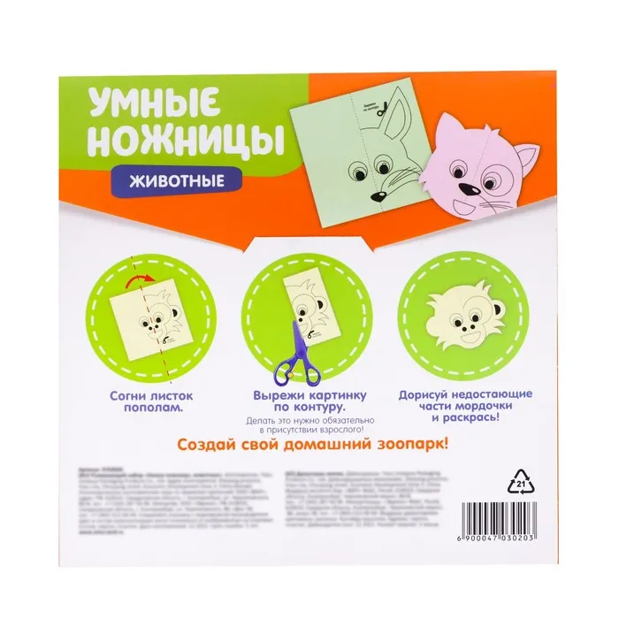 В комплект входит 20 развивающих заданий и ножницы. Малыш познакомится с весёлыми и добрыми зверюшками, запомнит их названия и как они выглядят.