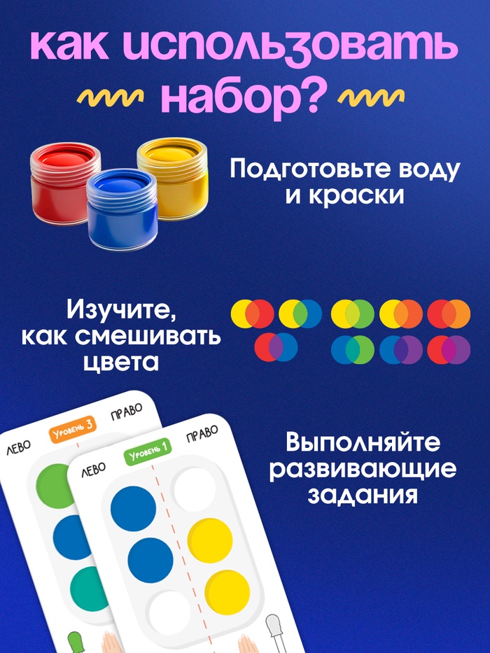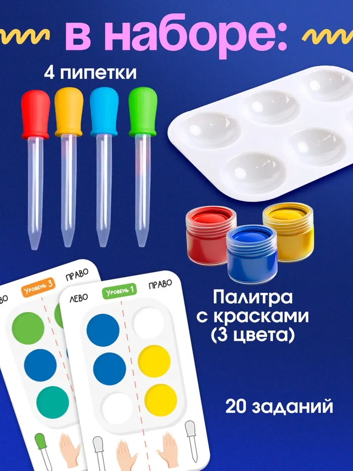 Внутри вы найдёте 4 цветные пипетки, 4 баночки с краской, палитру и карточки с 20 заданиями.