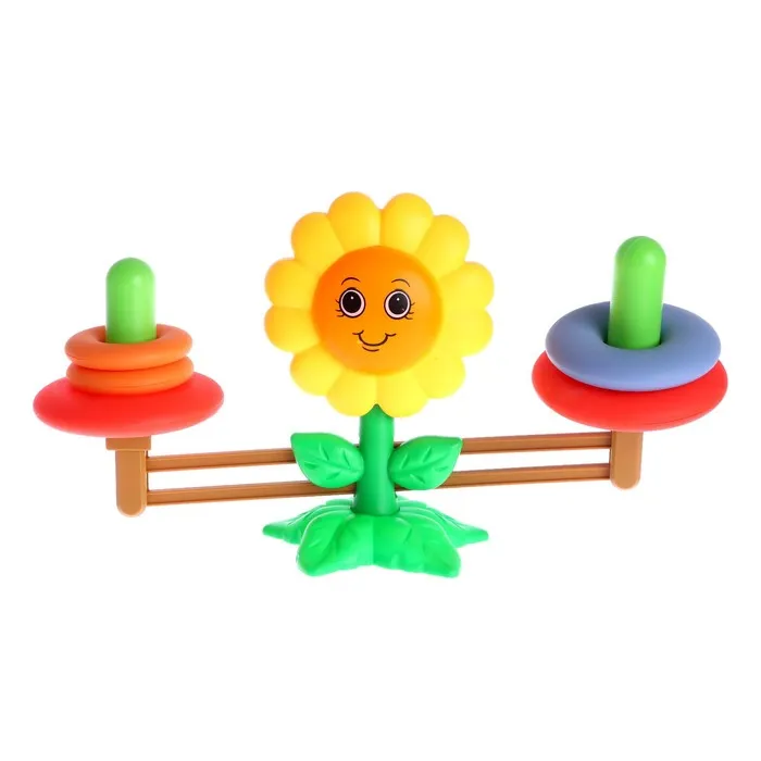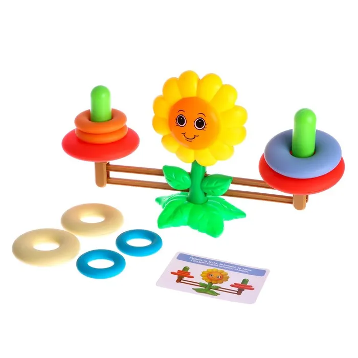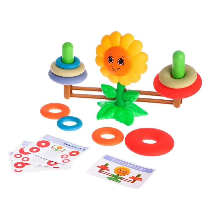 - Попросите кроху надеть на одну сторону несколько колец, а на другую поместить грузики, пока не установится равновесие. С помощью такого упражнения малыш научится различать понятия «тяжелее» и «легче».