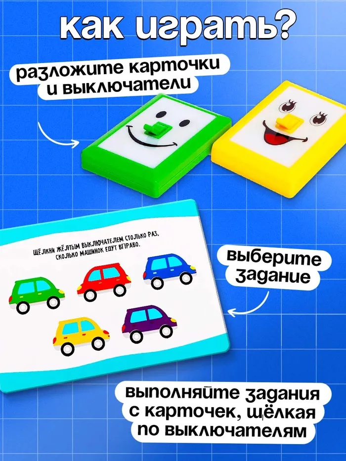 - Выполняйте задания с карточек. Например, щёлкните жёлтым выключателем столько раз, сколько машинок едет вправо, найдите самого большого мишку и щёлкните выключателем такого же цвета.