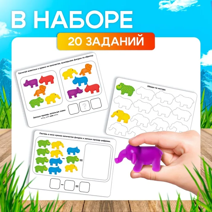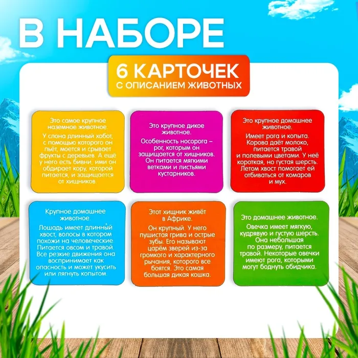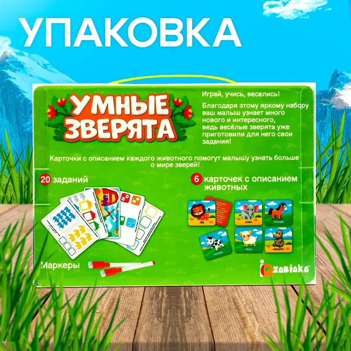 В комплекте 20 заданий, 6 карточек с описанием животных и 2 маркера «пиши-стирай».