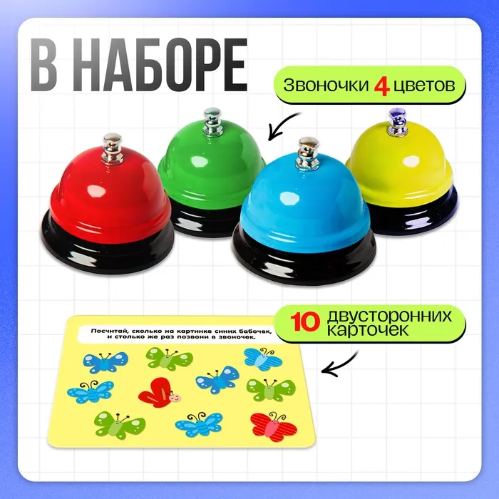 Развивающий набор станет любимой игрушкой вашего ребёнка. В нём малыш обнаружит 4 цветных звонких колокольчика. Они помогут ему запомнить цвета, цифры, научиться считать и решать много полезных заданий с карточек!