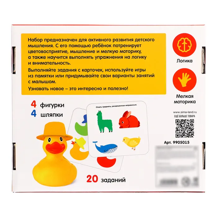 С развивающим набором «Утки и шляпки» ребёнок потренирует цветовосприятие, логику и моторику, а также научится выполнять упражнения на логику и внимательность.