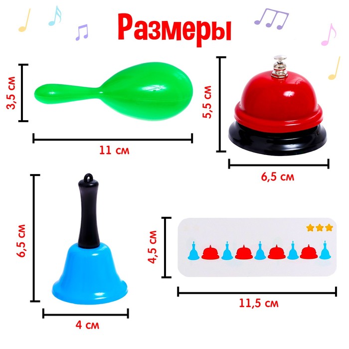 С развивающим набором «Весёлые ритмы» малыш в лёгкой игровой форме научится на слух воспринимать и повторять разнообразные последовательности звуков. В наборе вы найдёте колокольчик, звонок, маракас и 20 заданий.