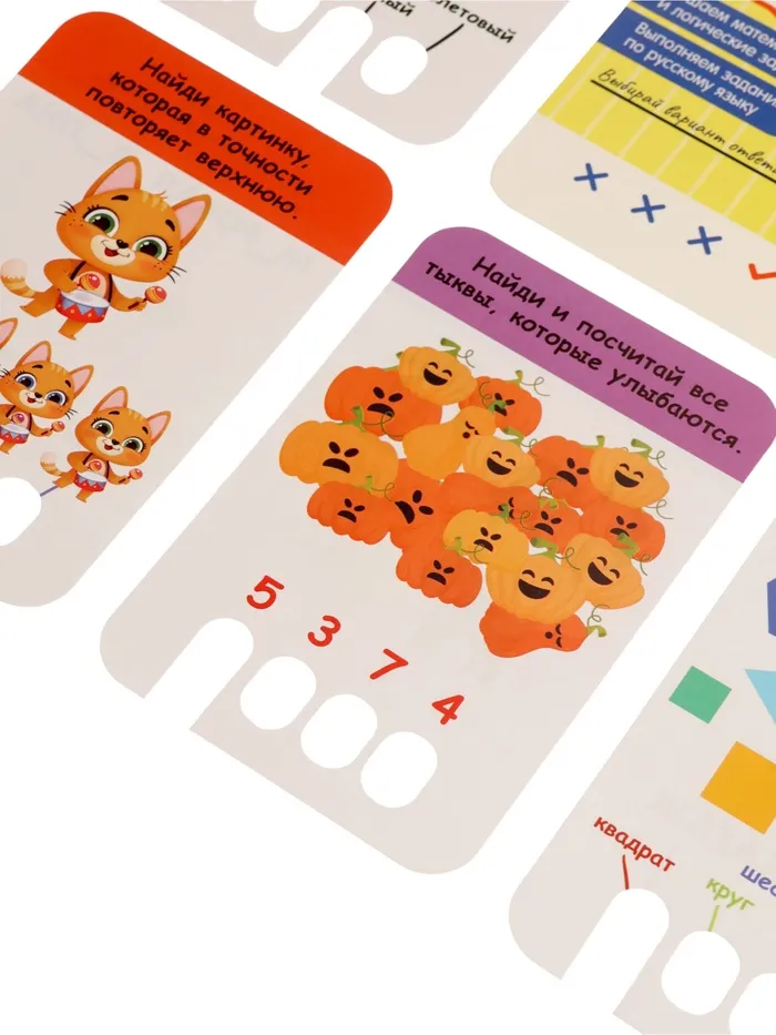 - 120 заданий на карточках — математические головоломки, логические цепочки и упражнения по русскому языку. Каждая карточка — новый вызов, который не даст заскучать.