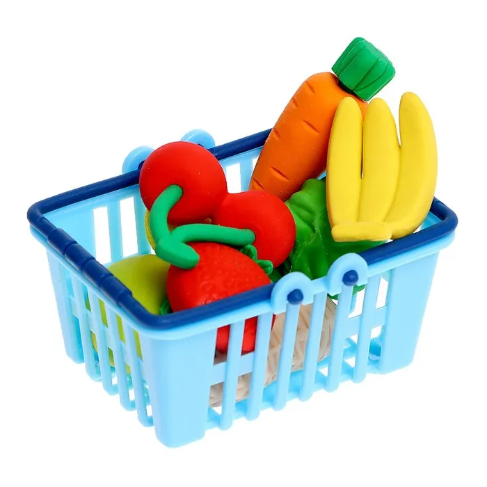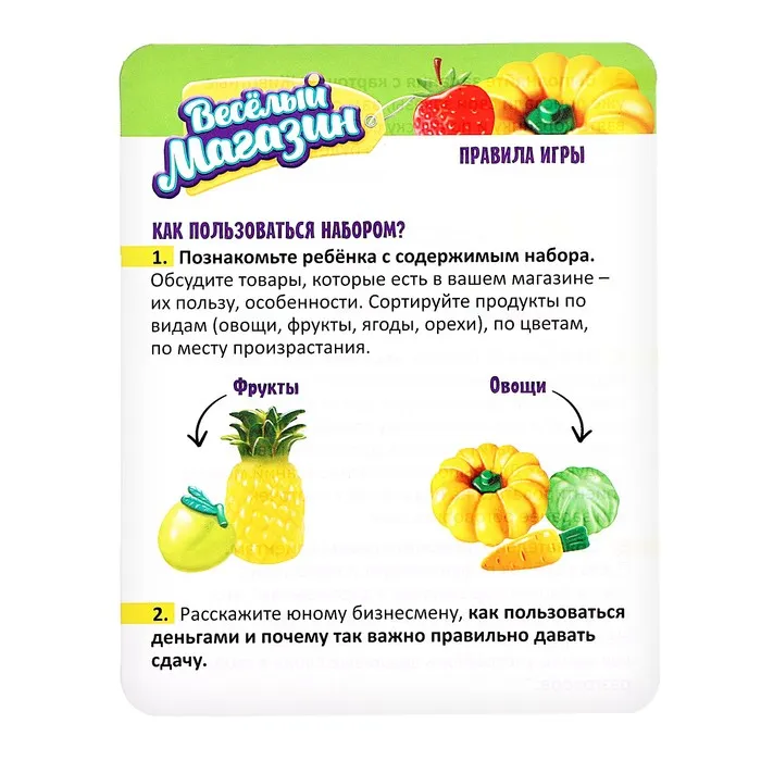 - Познакомьте ребёнка с содержимым набора. Обсудите товары, которые есть в магазине — их пользу, особенности.