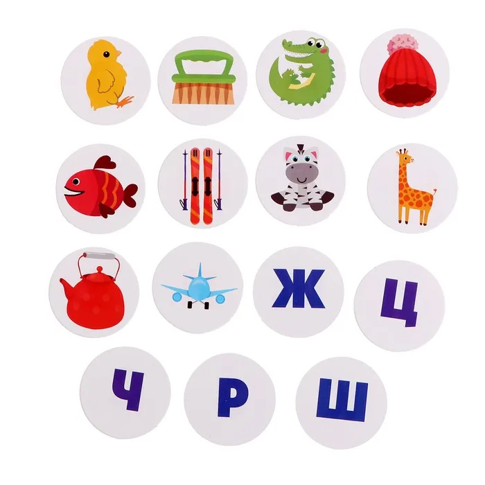 - Затем перемешайте карточки на круге и попросите ребёнка пальчиком соединить карточку с предметом и буквой, на которую он начинается.