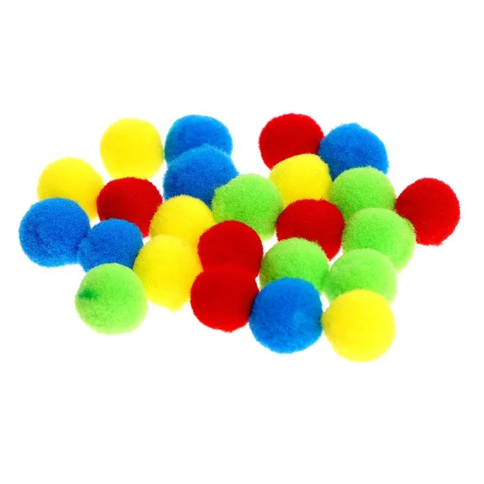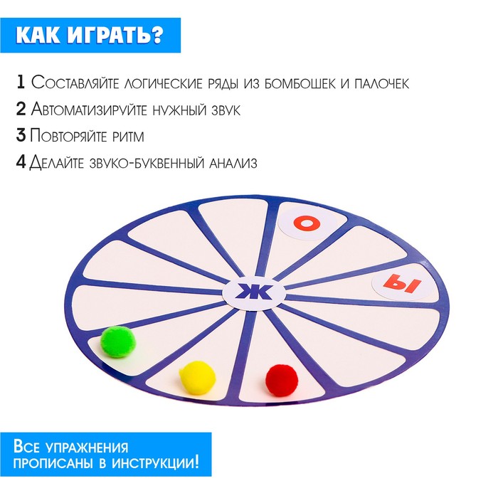 Внутри вы найдёте круг-тренажёр, 20 палочек, 15 карточек и 24 цветных бомбошки.