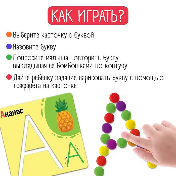- Попросите малыша повторить букву, выкладывая её бомбошками по контору.