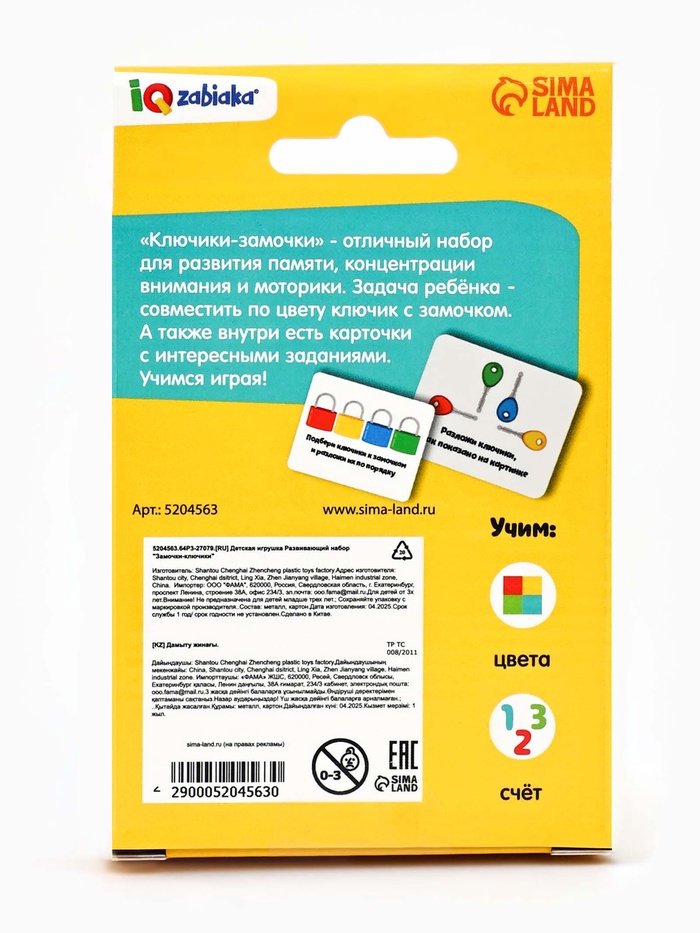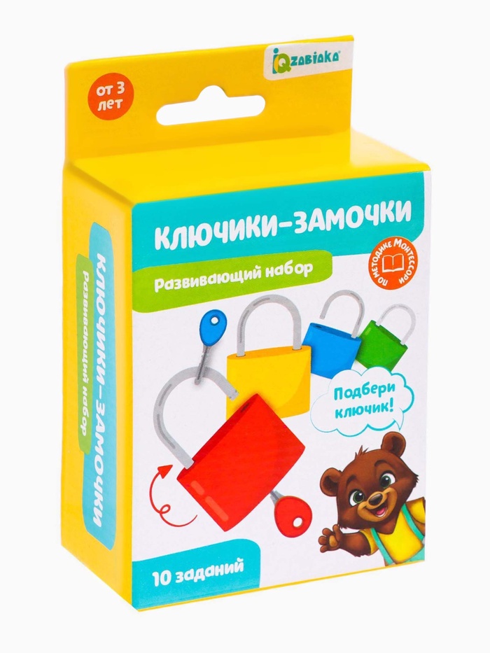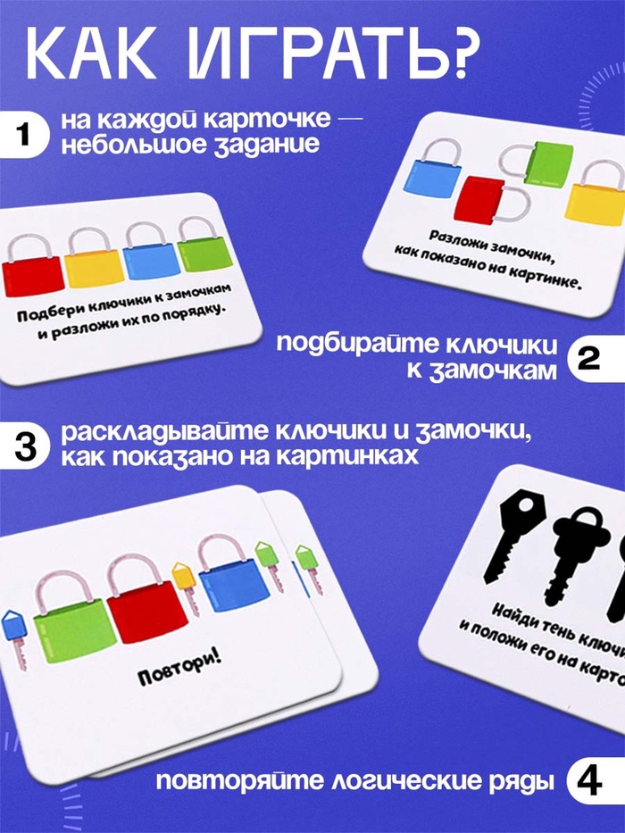 Задача ребёнка: совместить ключик с замочком по цвету. Внутри набора малыш обнаружит карточки с интересными заданиями.