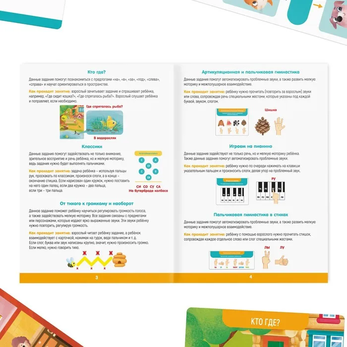 Перед вами многофункциональный набор обучающих карточек, которые помогут автоматизировать проблемные звуки, наладить взаимодействие полушарий мозга, развить мелкую моторику и многое другое. Особенность карточек в том, что ребёнок взаимодействует с ними напрямую: нажимает на клавиши пианино или жмёт на автомобильный гудок, показывает жестами звуки и слоги, регулирует громкость голоса и т. д.