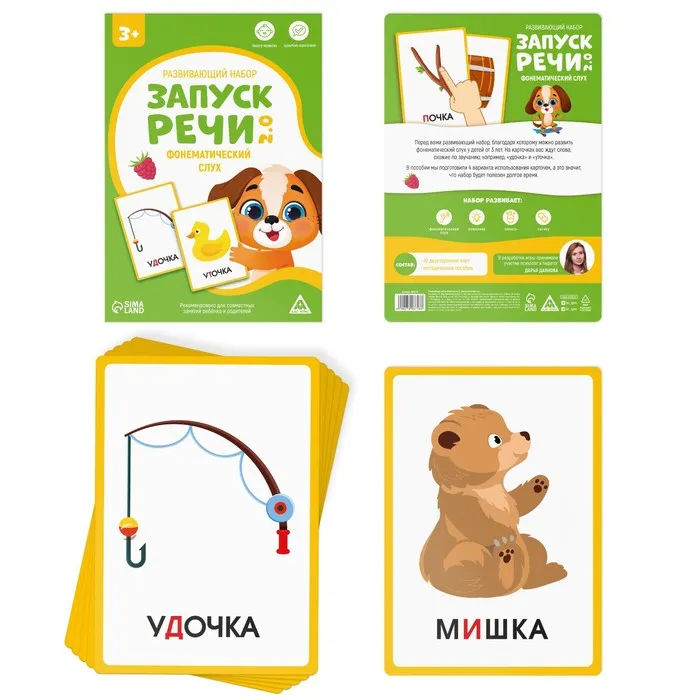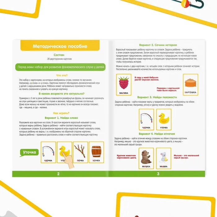 Перед вами набор, благодаря которому можно усовершенствовать фонематический слух у детей от 3 лет. На карточках представлены слова, схожие по звучанию. Например «удочка» и «уточка». В пособии мы подготовили 4 варианта использования карточек, а это значит, что набор будет полезен долгое время.