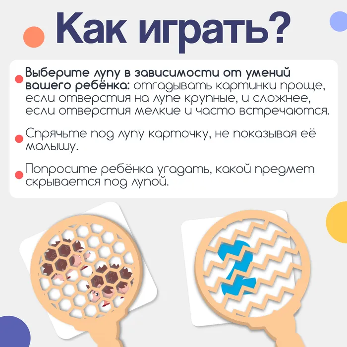 - Выберите лупу в зависимости от умений вашего ребёнка: отгадывать картинки проще, если отверстия на лупе крупные, и сложнее, если отверстия мелкие и часто встречаются.