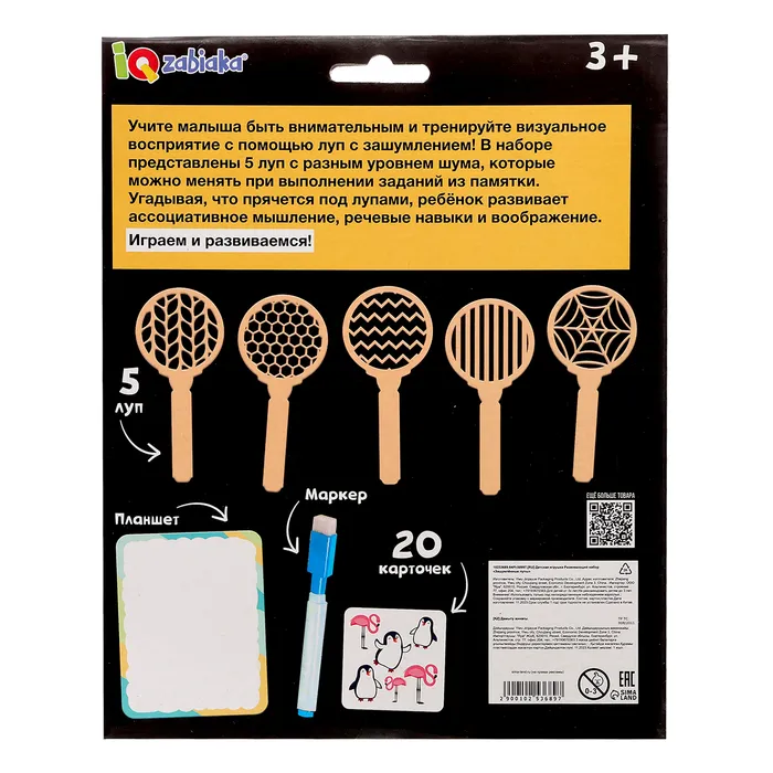 Развивающий набор «Зашумлённые лупы» разработан для тренировки внимательности и визуального восприятия. В наборе представлены 5 луп с разным уровнем шума, которые можно менять при выполнении заданий из памятки.