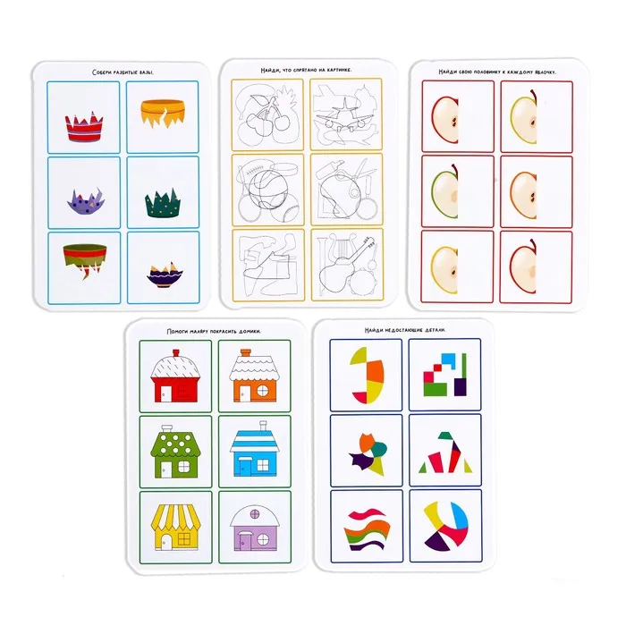 В наборе представлены большие карточки-основы, где малыш будет выполнять задания, и прозрачные карточки-дополнения. По цвету каёмки вы с малышом определите, какие карточки составляют одно задание.