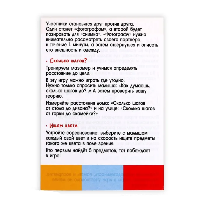 - «Сколько шагов» . Игра удобна тем, что в неё можно играть в любом месте. Один из участников спрашивает другого о возможном количестве шагов до любого выбранного предмета. Другой участник, поразмыслив, даёт приблизительное число шагов. Игра развивает логическое и пространственное мышление, внимание.
