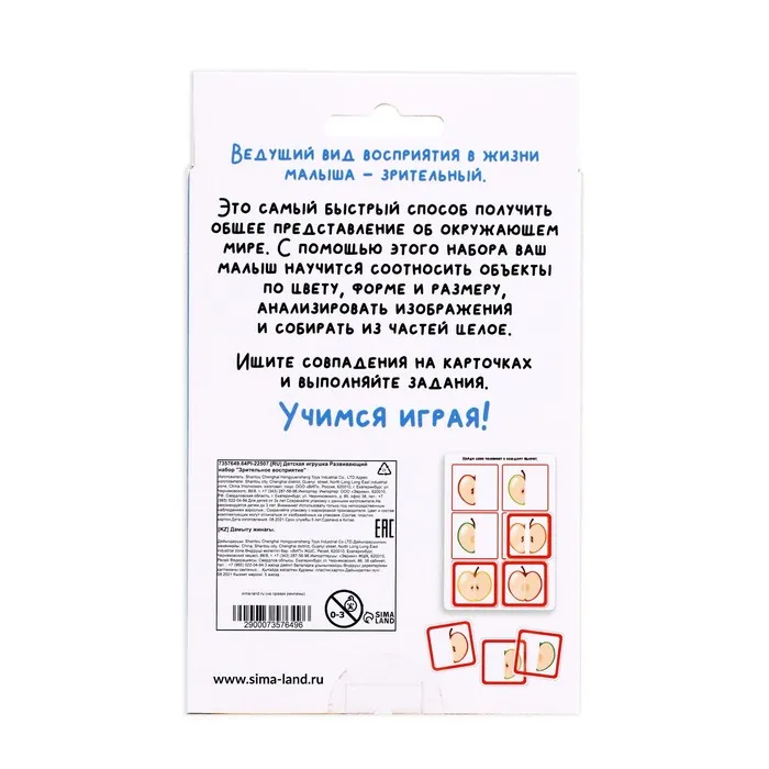С помощью этого набора ребёнок получит общее представление об окружающем мире. Он научится соотносить предметы по цвету, форме, размеру, анализировать изображения и собирать из частей целое.