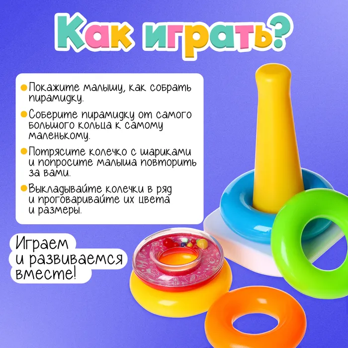 - Колечки отличаются по цвету и размеру, что способствует развитию фантазии ребёнка.
