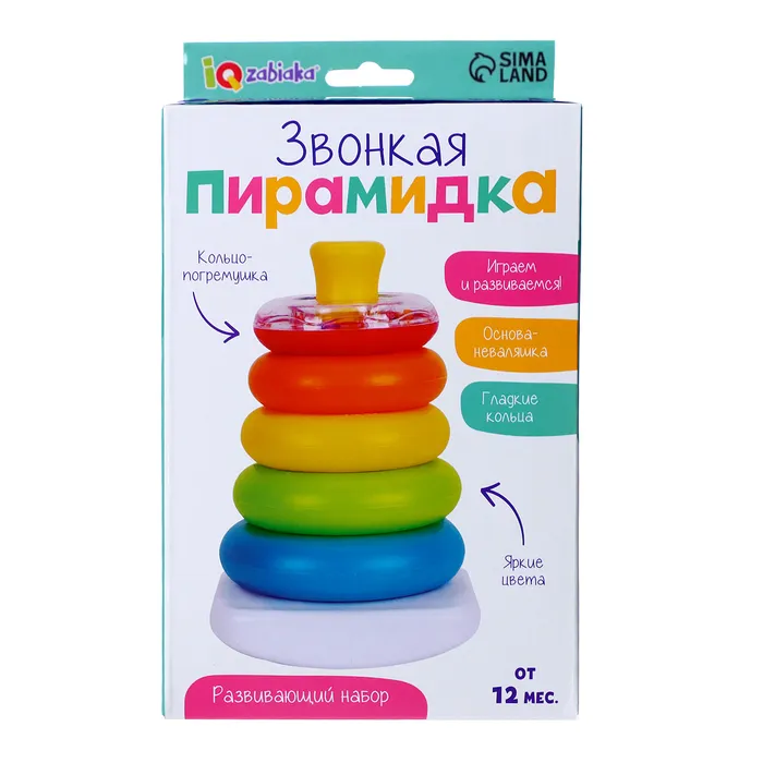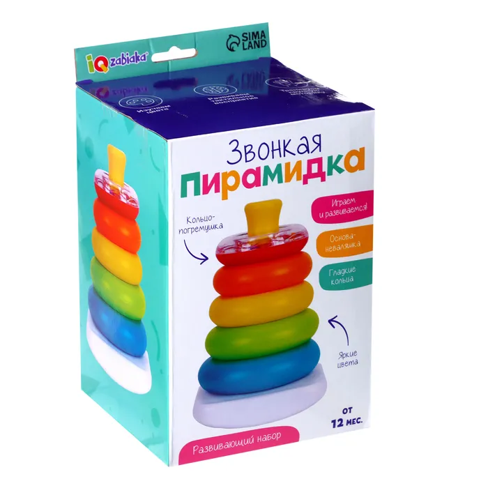 Развивающий набор «Звонкая пирамидка» разработана специально для малышей от 1 года. С такой игрушкой малыш познакомится с цветами и формами, с понятиями «сверху», «снизу», «большой», «маленький», а также потренирует пространственное мышление и воображение.