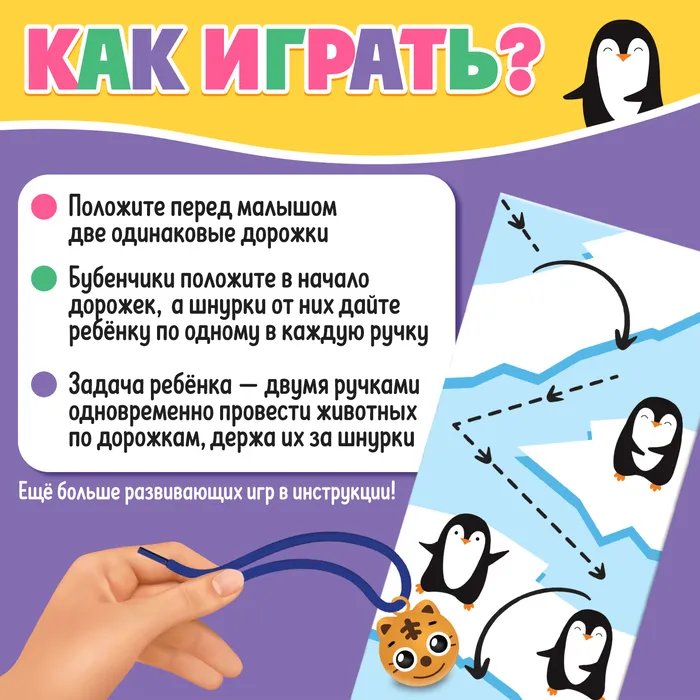 - Задача ребёнка — двумя ручками одновременно провести животных по дорожкам, держа их за шнурки.