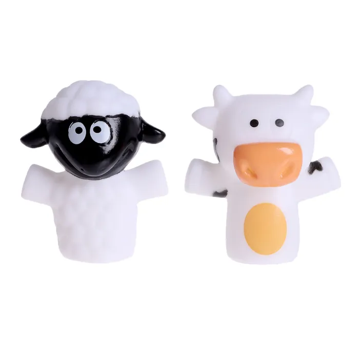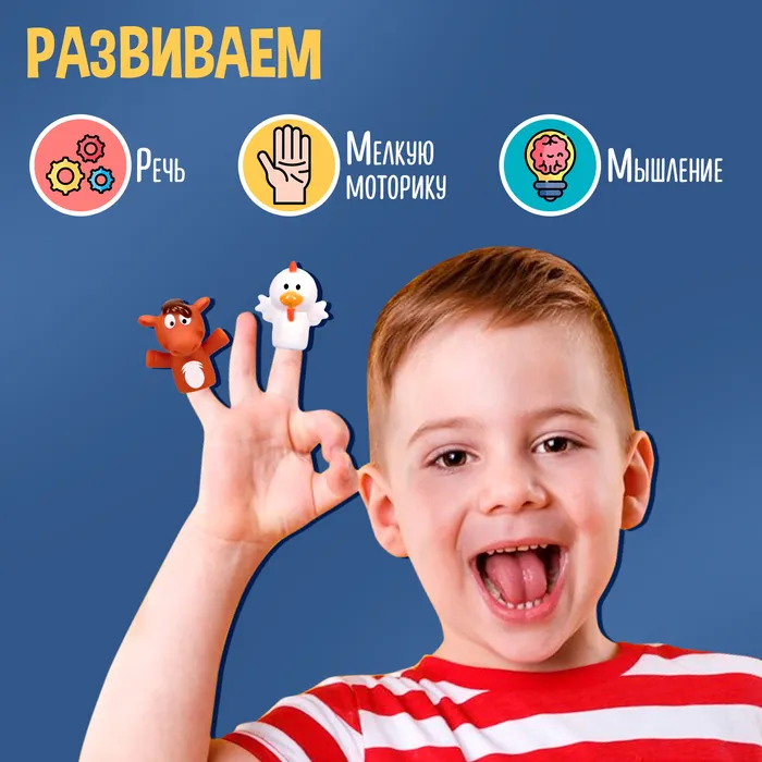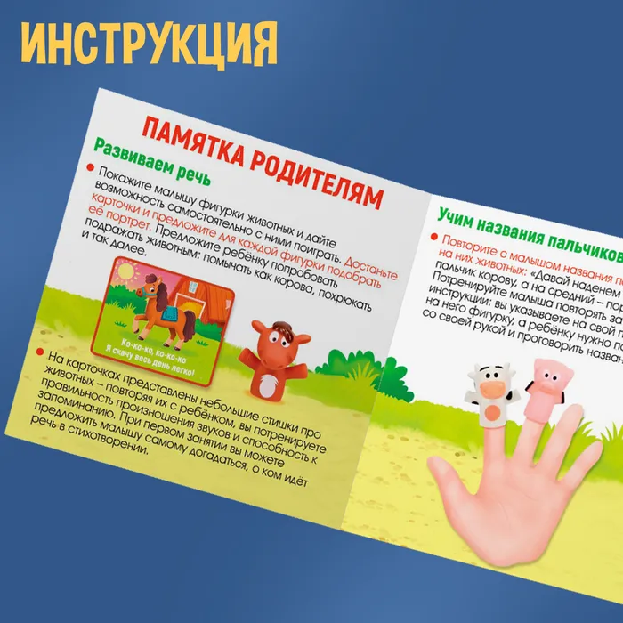 - Повторите с малышом названия пальчиков, рассаживая на них животных: «Давай наденем на указательный пальчик корову, а на средний — поросёнка». Потренируйте малыша повторять за вами визуальные инструкции: вы указываете на свой палец или надеваете на него фигурку, а ребёнку нужно повторить действие со своей рукой и проговорить название пальчика.