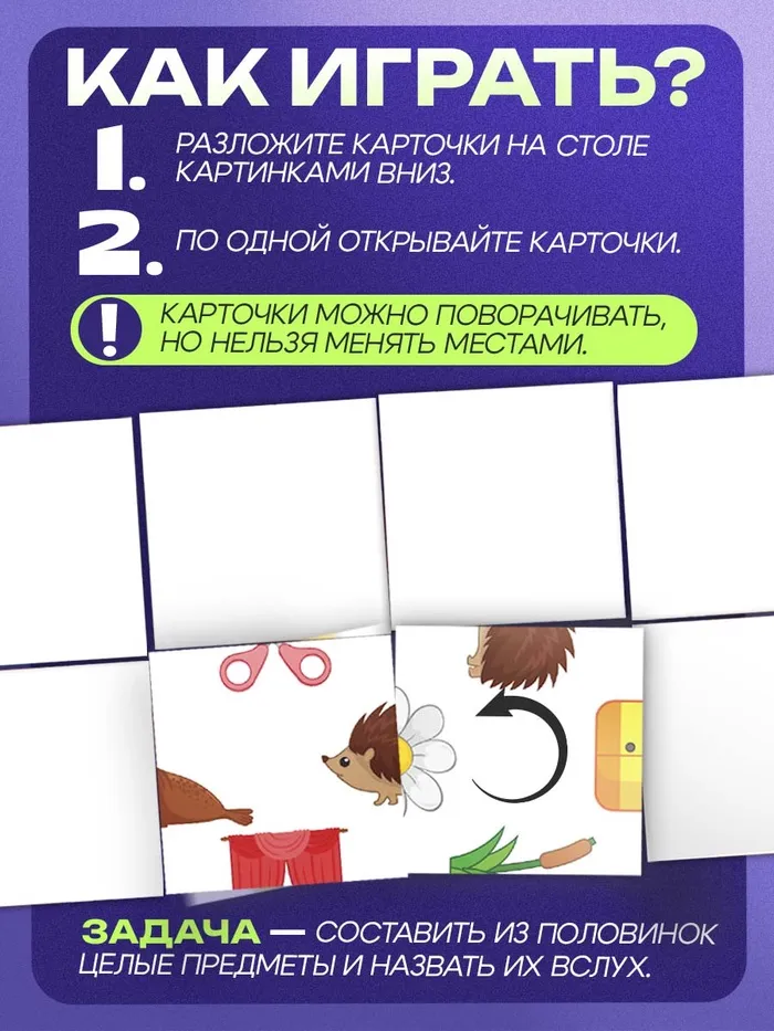 - Задача малыша — составить из половинок целые предметы и назвать их вслух.