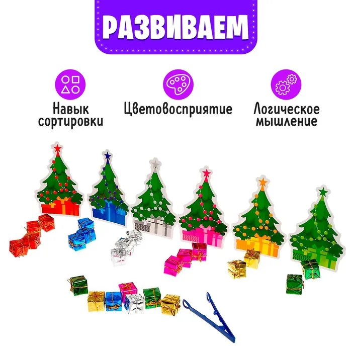 - Расставьте перед малышом все подарочки и ёлочки.