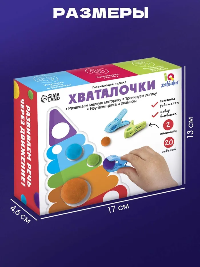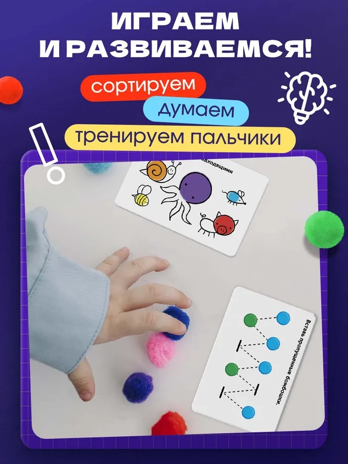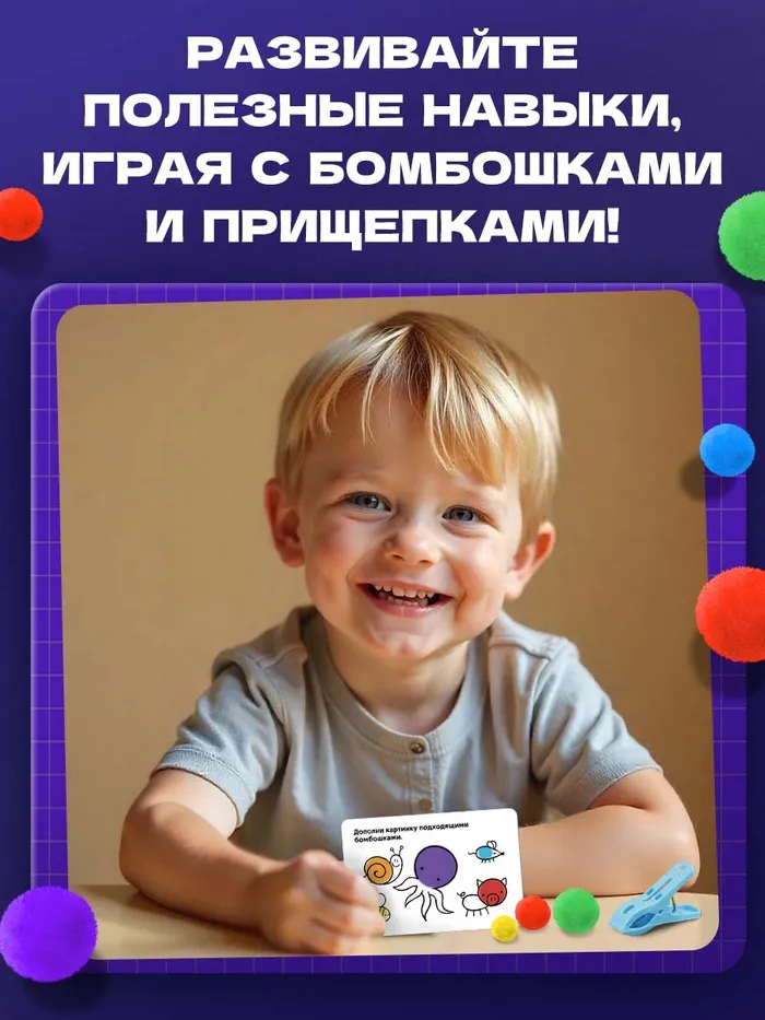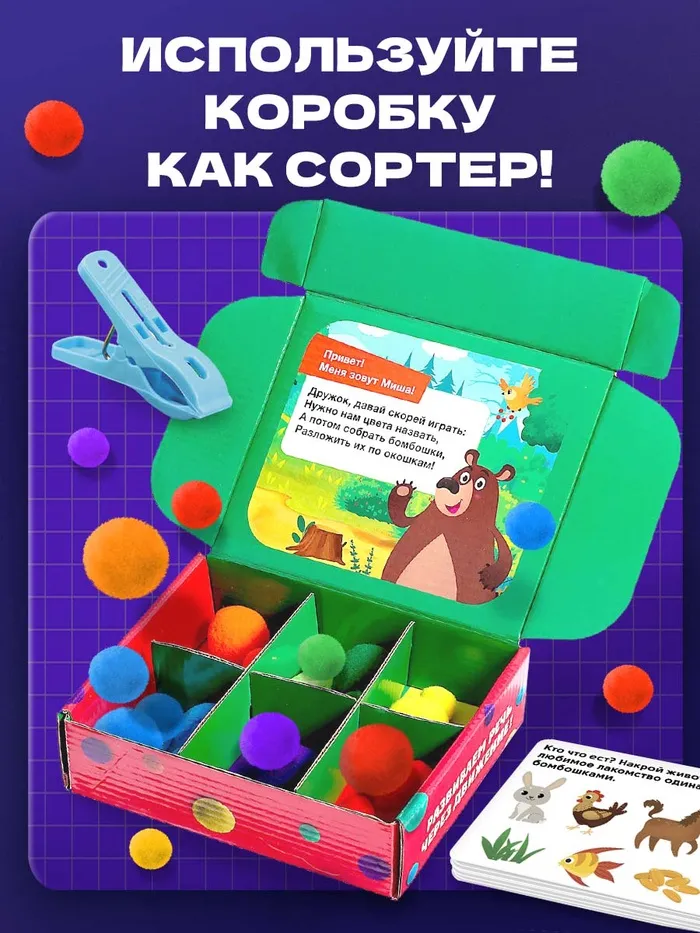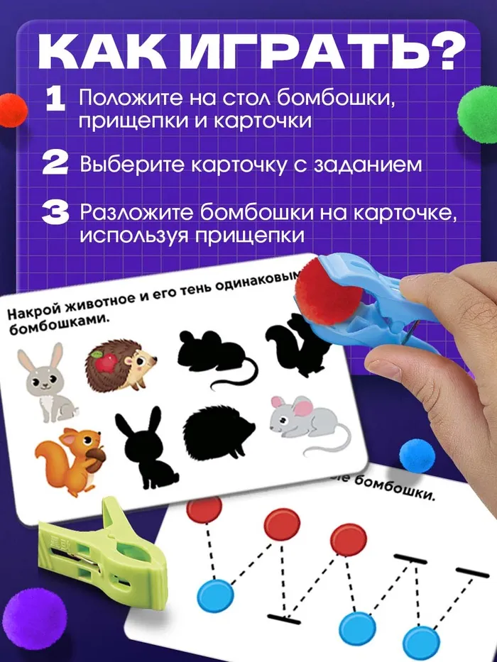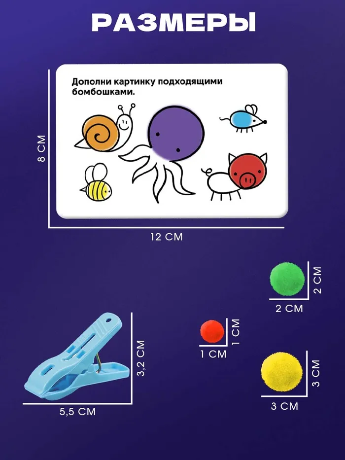 Внутри вы найдёте 18 цветных бомбошек разных размеров, 10 двусторонних карточек с 20 заданиями и 2 прищепки.