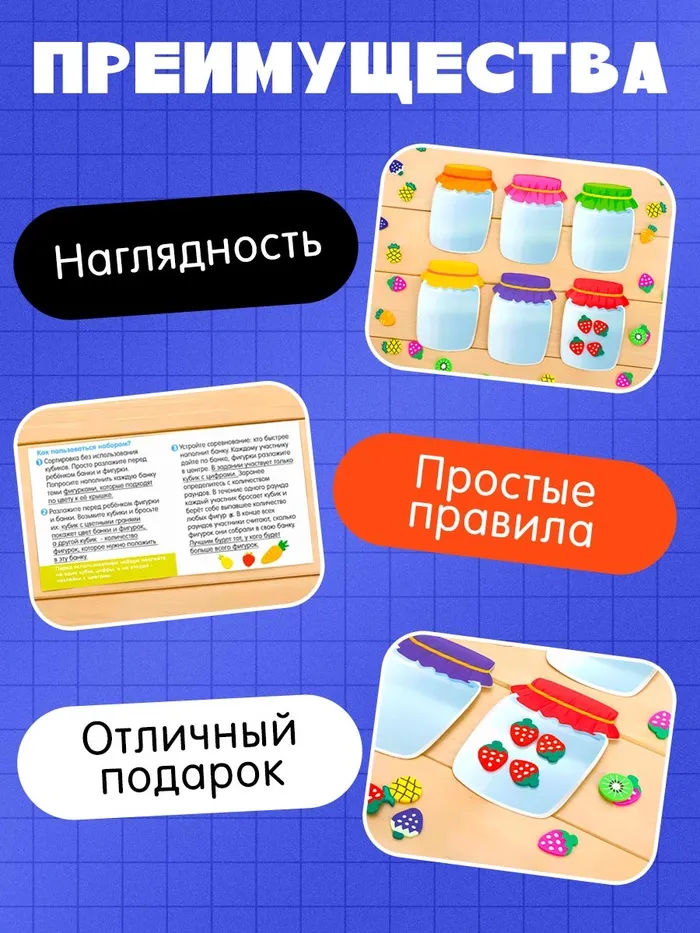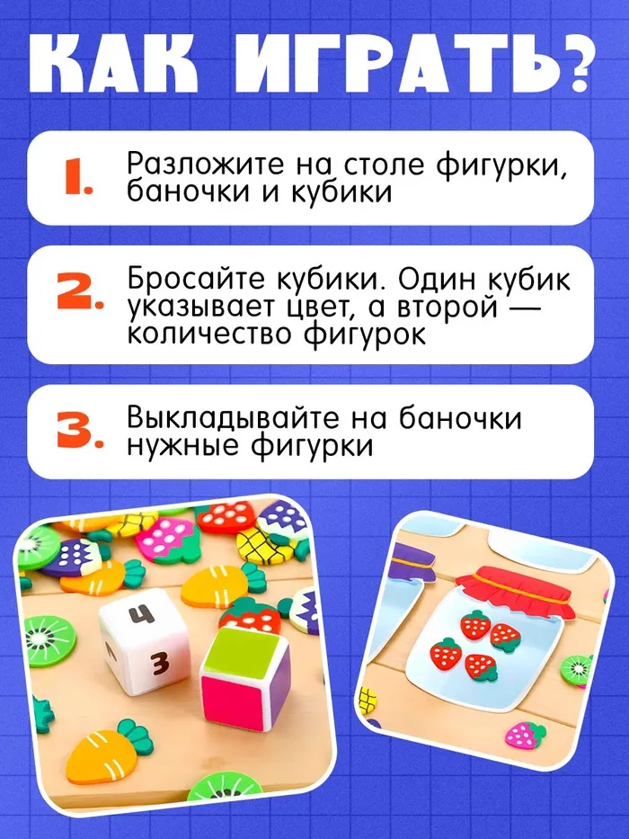 - Сортируйте фигурки с помощью кубиков — бросайте их и смотрите на результат. Кубик с цветными гранями покажет цвет банки и фигурок, другой укажет количество урожая, которое нужно положить в ёмкость.