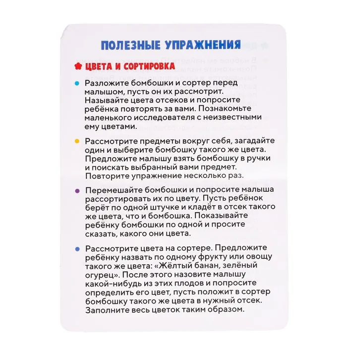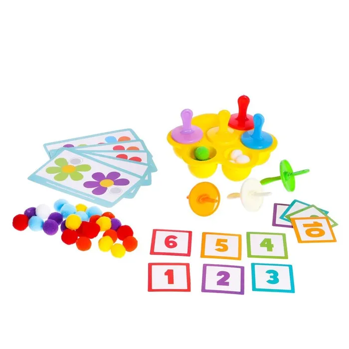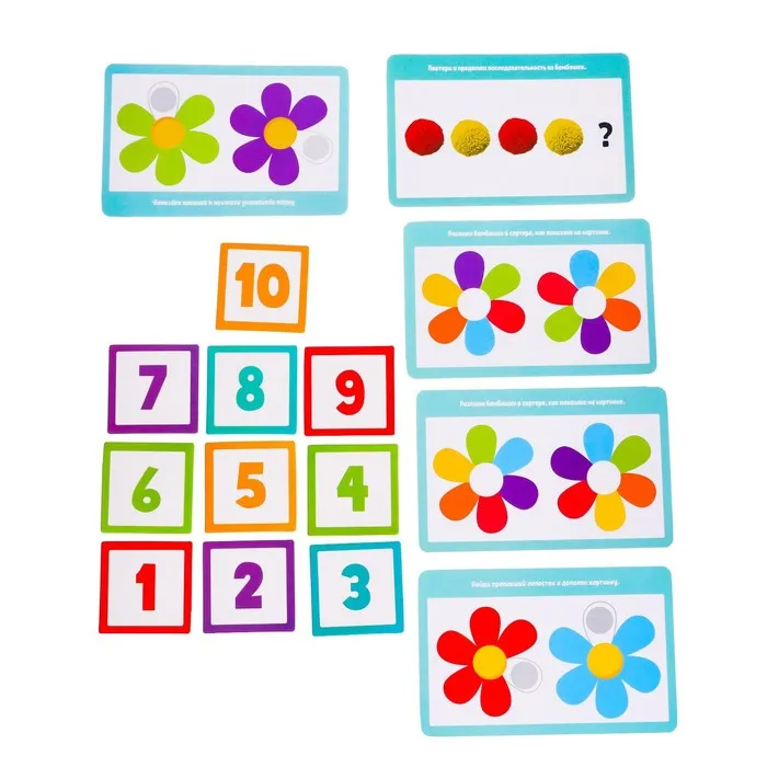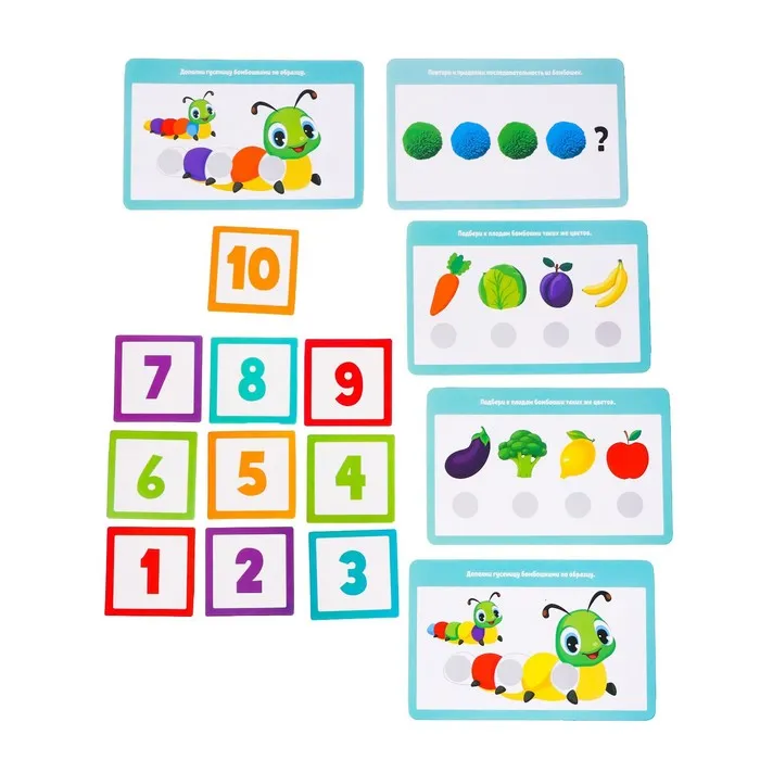 Внутри вы найдёте 10 заданий, 35 бомбошек, сортер, палочки с крышками и карточки с цифрами.