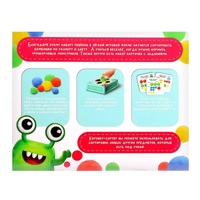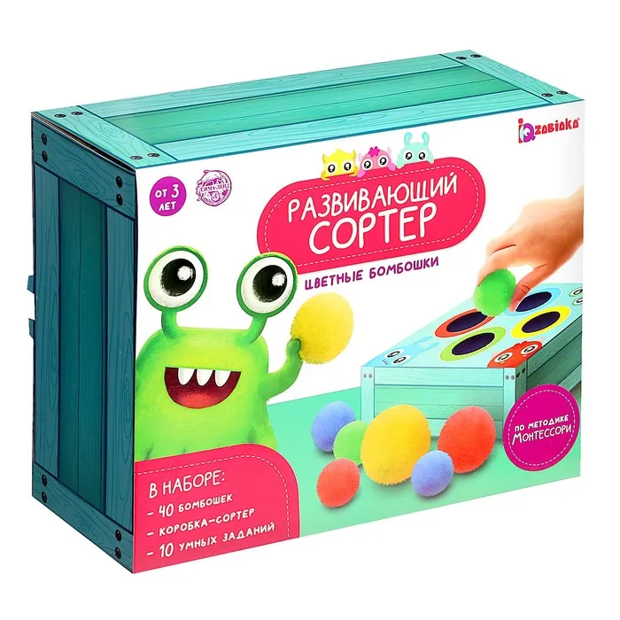 В комплекте есть 40 бомбошек, коробка-сортер и 10 логических заданий.