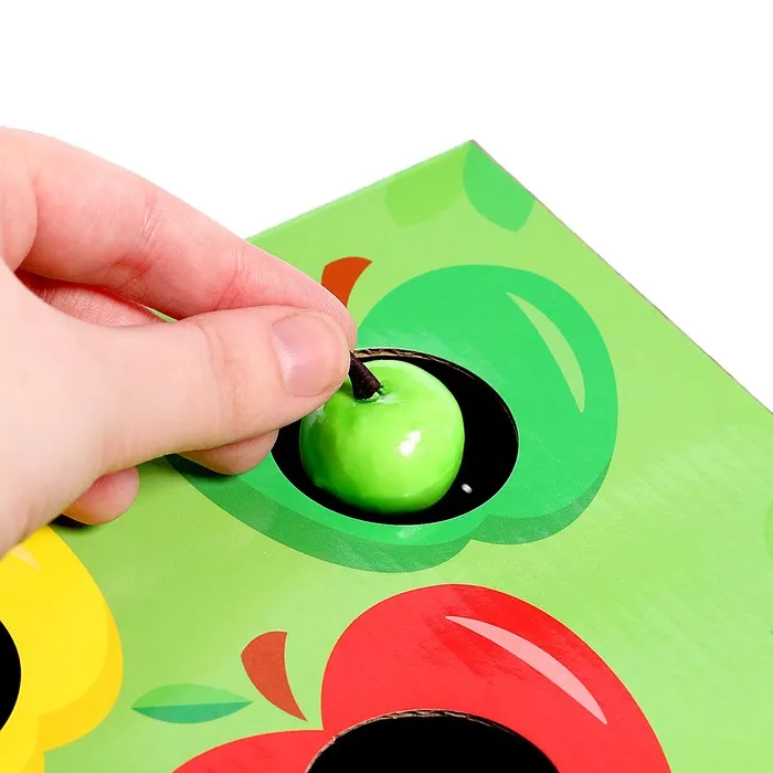 - Попросите кроху опустить яблочки в отверстия нужного цвета.