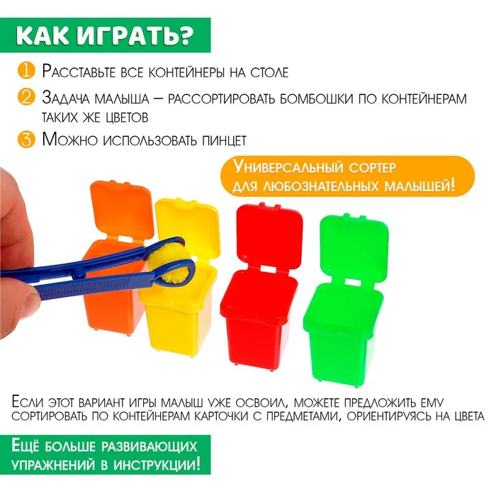 - Вместе с ребёнком проговорите цвета коробочек и дайте ребёнку возможность самостоятельно с ними поиграть: покажите, как закрывать и открывать крышку, научите малыша держать пинцет и продемонстрируйте, как с его помощью переносить бомбошки с места на место.