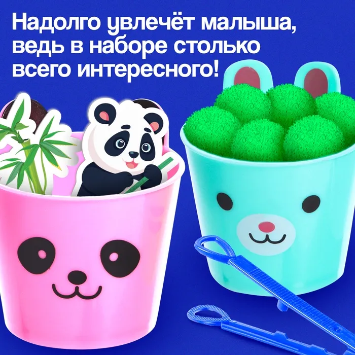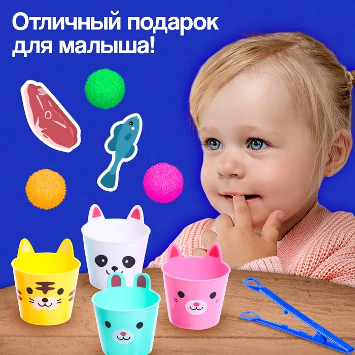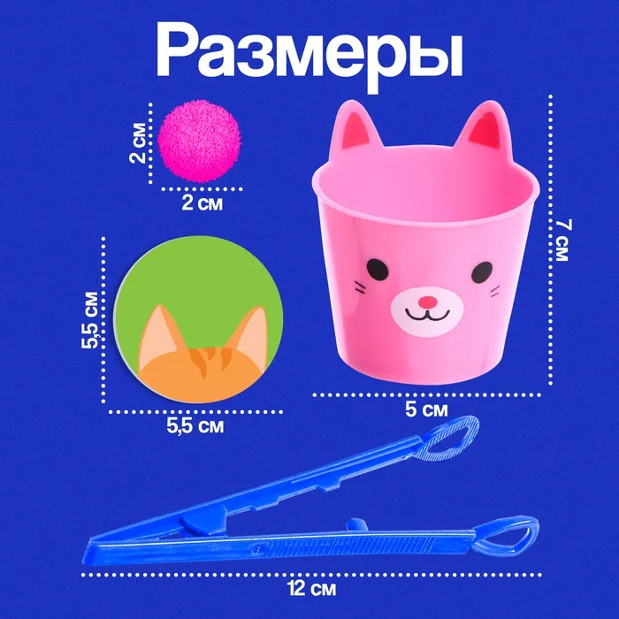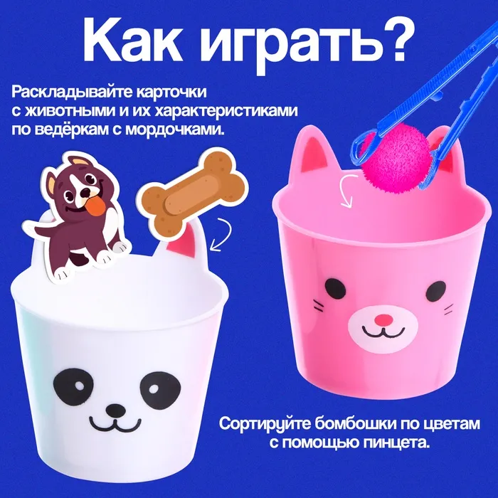 Внутри вы найдёте набор цветных бомбошек, 20 карточек, 5 ведёрок, пинцет и памятку для родителей.
