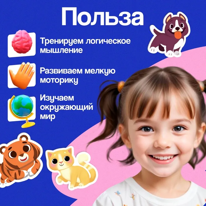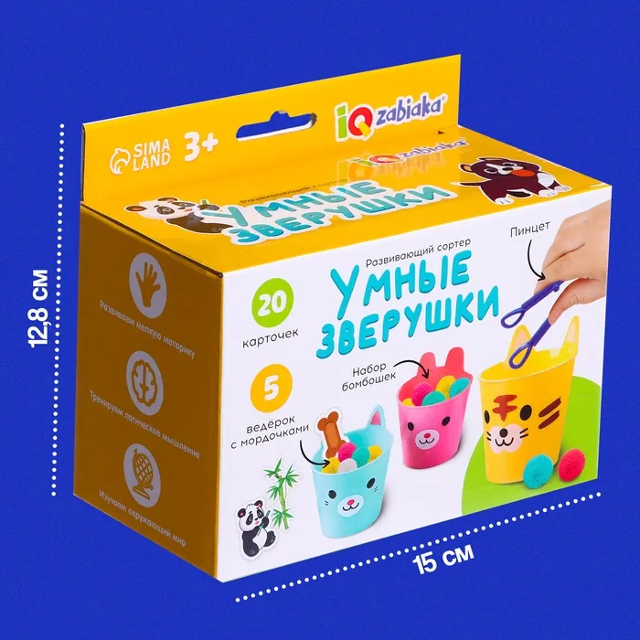 Развивающий сортер «Умные зверушки» поможет малышам от 3 лет изучить основные цвета и счёт, и потренировать мелкую моторику, раскладывая пинцетом бомбошки по забавным ведёркам с мордочками. А с помощью занятий с карточками вы познакомите ребёнка с разными животными, научите размышлять и расширите его кругозор.