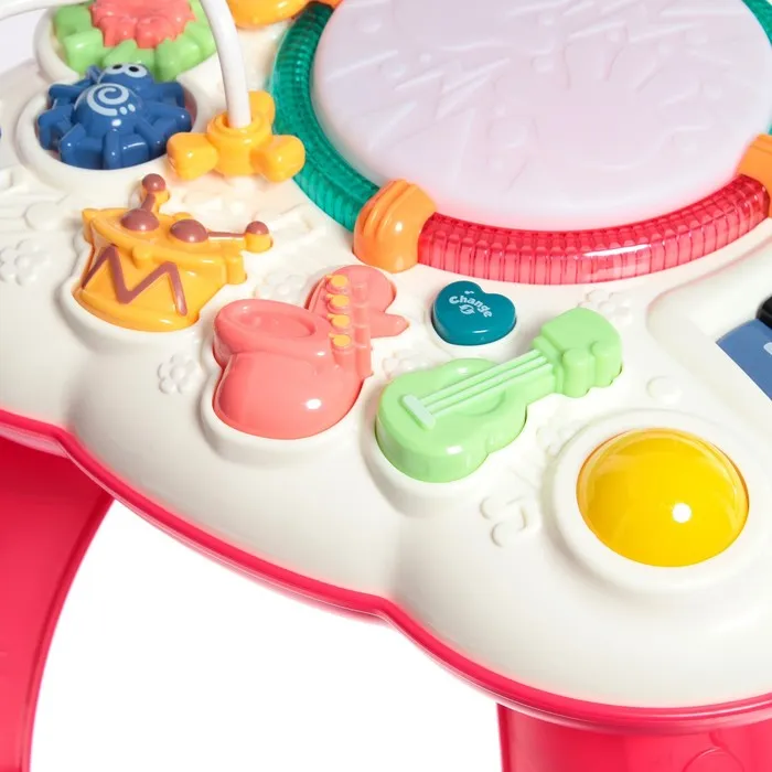 - Можно заниматься на миниатюрном пианино, стучать по звонкому барабану, нажимать и двигать детали.